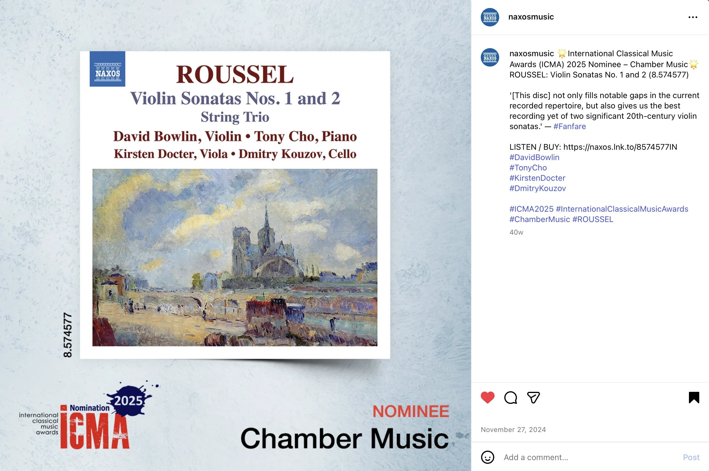 Roussel: Violin Sonatas and String Trio [headline] “this new disc is plainly excellent. Violinist David Bowlin and pianist Tony Cho play with evident technique, sensibility and stylish skill. Especially notable is how both players perform with a light, articulate touch that really suits this early 20th Century French music”